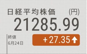 24日の東京株式市場で日経平均株価は反発した。終値は前週末比27円35銭(0.13%)高の2万1285円99銭だった。日本時間24日のシカゴ市場で米株価指数先物が堅調に推移し、米株式相場の先高観から日本株にも買いが入った。月末の米中首脳会談を前に両国が貿易交渉を続けるとの見方も相場を支えた。もっとも20カ国・地域首脳会議(G20大阪サミット)を控えて投資家の様子見姿勢が強く、東証1部の売買代金は約4年半ぶりの低い水準に落ち込んだ。