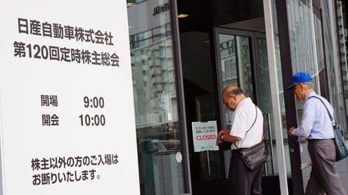 日産自動車は25日、横浜市内で定時株主総会を開催し、コーポレートガバナンスを強化するための指名委員会等設置会社への移行や西川広人社長らの取締役再任などを決議した。約3時間半に及んだ総会の株主発言で目立ったのは「西川社長、頑張って」との声。背景にあるのは日産の43%の株式を握り影響力行使を強める仏ルノーに対する、その他の株主の反発。「ルノー対その他」の構図が浮き上がった。