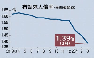 厚生労働省が28日発表した3月の有効求人倍率(季節調整値)は1.39倍で前月から0.06ポイント下がった。2016年9月以来の低い水準となった。新型コロナウイルスの感染拡大を受け、1月から急低下している。19年12月と比べると0.2ポイント近く減少した。
