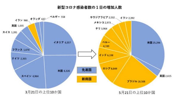 1日の増加人数を国別に見ると、2カ月前の3月21日の上位10カ国はイタリアや米国、スペインなど先進国が占めた。新興国はイランだけだった。
