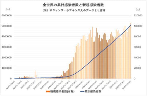 米東部時間22日午後4時(日本時間23日午前5時)時点で、世界の累計の感染者数は516万人を超え、死者数は33万6千人あまりとなった。最初に感染が拡大した中国の感染者数(8万4千人超)をすでに12カ国が上回っている。