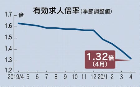 4月は有効求人数が前月から8.5%減っただけでなく、有効求職者数も前月から3.4%減った。新型コロナウイルスの感染拡大で求職活動を控えた人がいたとみられる。仕事を探したくてもできなかった人を含めれば、有効求人倍率はさらに低下していた可能性がある。