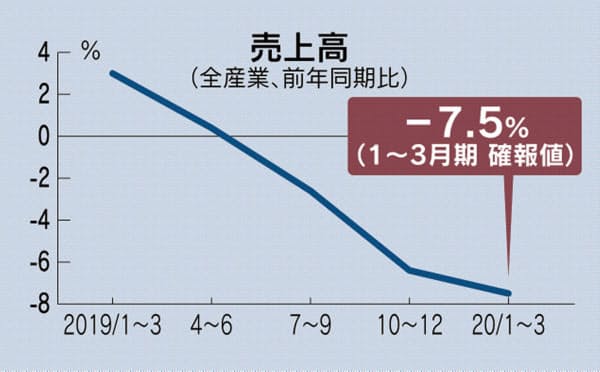 財務省が27日発表した1~3月期の法人企業統計の確報によると、全産業(金融・保険業を除く)の売上高は前年同期に比べて7.5%減の344兆5897億円だった。減少幅を速報値(3.5%減)から下方修正した。新型コロナウイルスの感染拡大で小売りやサービス業が落ち込み、東日本大震災の影響が出た11年4~6月期以来の落ち込みとなった。