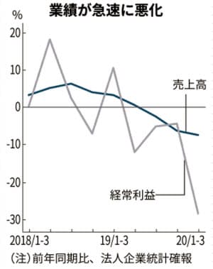 非製造業が8.3%減、製造業は5.5%減だった。飲食・宿泊などのサービス業が13.3%減と大幅に減った。財務省の担当者は「コロナで来客数が減ったことが響いた」と説明した。原油安などの影響で卸売・小売業も13.3%減った。