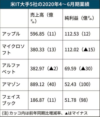 米巨大IT(情報技術)4社が30日、2020年4~6月期決算を発表した。アップルとフェイスブックはいずれも前年同期比11%の増収となり、アマゾン・ドット・コムの純利益は2倍になった。一方、ネット広告の減少で米グーグルの持ち株会社アルファベットは初の減収となった。