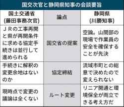 リニア中央新幹線の静岡工区を巡り、国土交通省の藤田耕三事務次官と静岡県の川勝平太知事が10日、静岡県庁で会談した。次官は自然環境への影響が軽微な範囲でJR東海が準備工事をする案を説明し、県の理解を求めた。知事は工区をまたぐ大井川の水資源確保や作業員の安全を優先するよう主張。静岡県を迂回するよう、リニアのルート変更にも言及した。