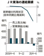 JR東海の売上高は新幹線の依存度が高く、20年3月期は7割近くを占めていた。コロナ禍で企業の出張や観光、帰省といった需要が急減し、4~6月の新幹線の利用は前年同期比で84%減った。百貨店やホテルなどの事業もふるわなかった。