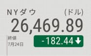 【NQNニューヨーク=川内資子】24日の米株式相場は続落した。ダウ工業株30種平均は前日比182ドル44セント(0.7%)安の2万6469ドル89セントで終えた。前日夕に四半期決算と同時に最先端半導体の発売の遅れを発表した半導体のインテルが急落し、相場の重荷になった。米中関係の悪化への懸念が強まったのも投資家心理を冷やした。