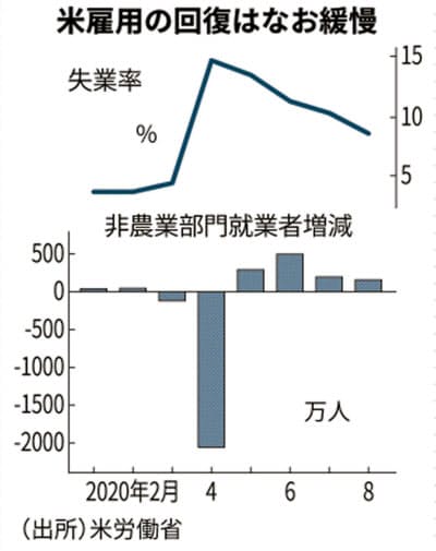 市場は8月の失業率を9.8%、就業者数の増加幅を140万人増とみていた。米失業率は新型コロナの感染拡大による経済封鎖で4月に戦後最悪の14.7%まで悪化。その後は4カ月連続で持ち直し、金融危機時のピーク(2009年10月、10.0%)も下回った。