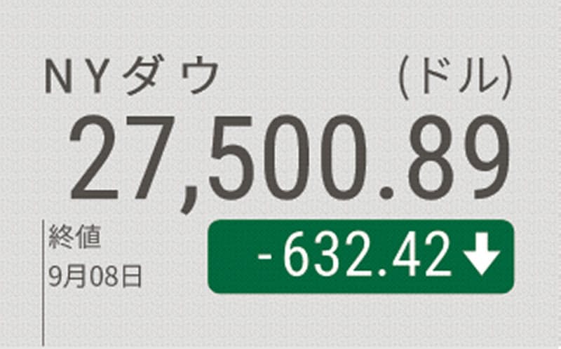 【ニューヨーク=後藤達也】8日の米株式相場は大幅続落した。ダウ工業株30種平均の終値は先週末比632ドル42セント安の2万7500ドル89セント。8月に急上昇した大手IT(情報技術)株を中心に調整売りが強まった。IT株の多いナスダック総合指数は2日に付けた史上最高値からの下落率は10%を超えた。