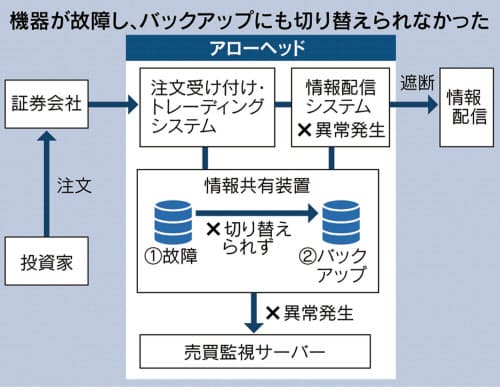 東証によると、2010年に導入した高速取引システム「アローヘッド」では、銘柄名やその日の基準値段など基本的な情報を格納しているディスクが2つあり、「共有ディスク装置」と呼ばれる。今回は午前7時4分に1号機のディスクの故障を検知。通常は、1号機と同じ情報を書き込んでいる2号機に自動的に切り替わるが、バックアップがうまくいかなかった。