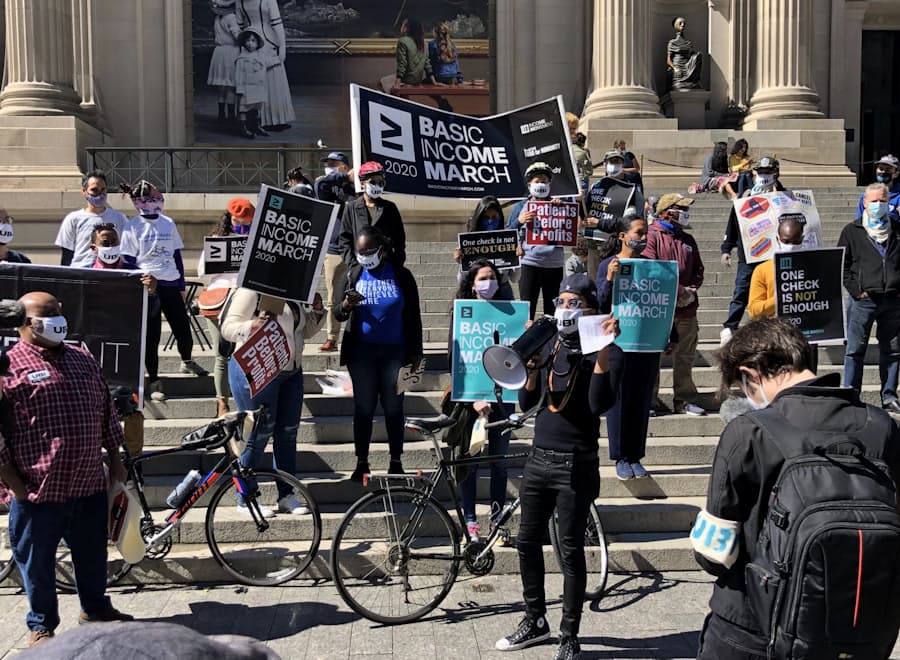 「小切手1枚では足りない」。米ニューヨークで9月、失業した若者らが所得保障を政府に求めた。米国は新型コロナウイルス対策で1人に最大1200ドル(約13万円)を配った。仮に同額を12カ月配ると、過去最大だった2020会計年度の財政赤字(330兆円)と同規模の財源が要る。