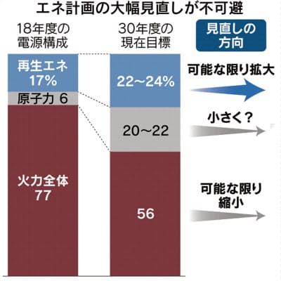 現在は発電量全体の7割超を火力発電でまかなう。石炭火力への依存に国際的な批判が集まるなか、原子力にも国民の厳しい視線が集まり、再生エネを安定的で低コストの電源に成長させる必要性が高まっている。梶山弘志経産相は、次期計画で再生エネを他の電源より上位の主力電源にする意向を示している。