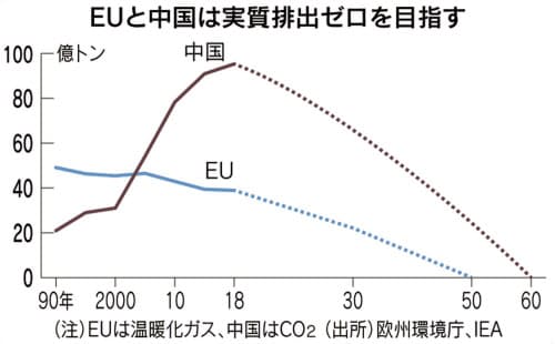 菅義偉首相が26日表明した温暖化ガス排出を「実質ゼロ」にする目標に関し、具体的な計画づくりで先行するのは欧州連合(EU)と中国だ。再生可能エネルギーや省エネの拡大に加え、水素社会の実現がカギとみる。官民挙げての技術開発競争が激化してきた。