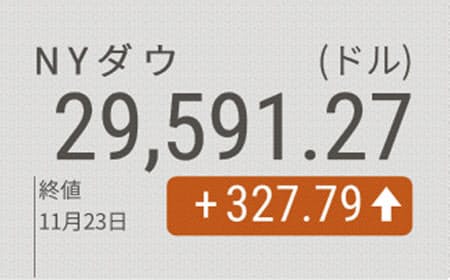 【NQNニューヨーク=張間正義】23日の米株式市場でダウ工業株30種平均は反発し、前週末比327ドル79セント(1.1%)高の2万9591ドル27セントで終えた。英製薬アストラゼネカが23日、オックスフォード大学と共同開発する新型コロナウイルスのワクチンの臨床試験で、最大90%の有効性を確認したと発表。米製薬ファイザーが開発中のワクチンの接種が12月11日にも始まる見通しになるなど、ワクチン開発を巡る好材料が相次いだ。経済活動の正常化が進むとの期待が広がった。