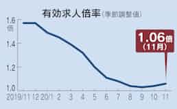 有効求人倍率は仕事を探す人1人に対し、企業から何件の求人があるかを示すもので、改善は2カ月連続。1月から9月まで9カ月連続で低下し、10月から上昇に転じていた。11月は企業からの有効求人が前月から3%増え、働く意欲のある有効求職者は1.5%増えた。