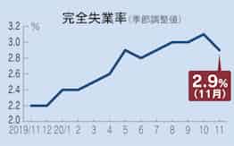 総務省が25日発表した11月の完全失業率(季節調整値)は2.9%で、前月比0.2ポイント低下した。厚生労働省が25日発表した11月の有効求人倍率(季節調整値)は1.06倍で前月から0.02ポイント上昇した。