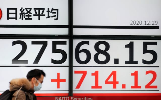 29日の東京株式市場で日経平均株価が大幅続伸し、前日比714円12銭(3%)高の2万7568円15銭で取引を終えた。1990年8月以来、30年4カ月ぶりの高値をつけた。米追加経済対策が成立したことで前日の米株式相場が上昇。世界景気と連動性が高いとされる日本株も幅広い投資家の買いを集めた。