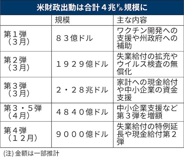 米政権・議会による新型コロナ対策は今回が第4弾で、歳出規模は合計4兆㌦とGDPの20%前後に達する。今回の9000億㌦の対策は第3弾(2.2兆㌦)に次いで大きく、金融危機時の09年2月の景気対策(7870億㌦)などを上回る規模だ。超党派機関「責任ある連邦予算委員会」の試算では、21年の米GDPを2%押し上げる規模だという。