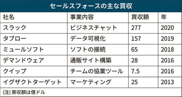 顧客情報管理(CRM)ソフトから始め、企業買収を重ねてマーケティングや通販サイトの構築、データ分析などに事業を広げてきた。スラックの買収額は19年に取得したデータ可視化ソフトの米タブローソフトウェア(157億ドル)を上回り、セールスフォースにとって過去最大となる。