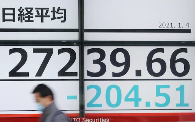 2021年の取引初日となった4日の東京株式市場で、日経平均株価は20年末比で131円40銭(0.5%)高の2万7575円57銭で寄り付いた。もっとも、朝高後は売りが膨らみ、下落に転じる場面もあった。前年末比の下げ幅は一時300円を超えた。日本で東京都知事など首都圏の首長が政府に緊急事態宣言の発令を要請し、政府は感染拡大阻止のための措置の検討に入っている。この日に予定されている菅義偉首相の会見などの内容を見極めたいとの思惑が強まった。
