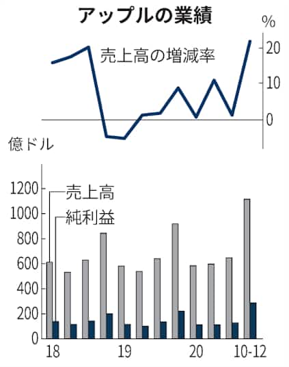 全体の約6割を占めるiPhoneの売上高は17%増の655億9700万ドルだった。アップルは高速通信規格「5G」に対応した「12」シリーズを20年10月下旬から順次発売した。19年と比べて1カ月あまり遅い投入だったが、単価の上昇などを背景に過去最高の販売額となった。