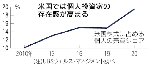 UBSウェルス・マネジメントの調査では20年の米国株式に占める個人の売買シェアは19.5%と19年比で4.6㌽、10年比で9.4㌽上昇している。ロビンフッド経由での短期売買は未成年者の取引も多く、最近は経済対策による現金給付が新たな原資になっているとの指摘も多い。ロビンフッドは顧客に十分にリスクやコストを説明していないとして金融当局から罰金も受けている。