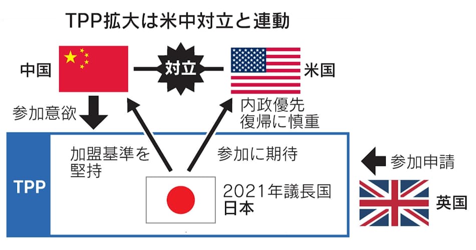 日本を含む11カ国による環太平洋経済連携協定(TPP)が枠組みの拡大へ動き出した。初の新規加入を英国が2月1日に申請する。議長国を務める日本は自由度の高い通商ルールを受け入れるという加盟条件を堅持して英国と交渉する。参加意欲を示す中国をにらんだ対応である。