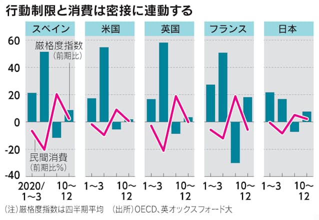 経済協力開発機構(OECD)の加盟37カ国を対象に、英オックスフォード大が算出する行動制限の厳格度指数と実質民間最終消費支出(個人消費)の関係を調べると、制限の緩和度合いが大きいほど消費の急回復につながることが分かった。厳格度指数は移動やイベントの制限など9つの指標をもとに厳格度をゼロから100の間で指数化している。