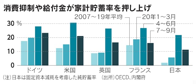 消費回復を後押しするのがコロナ禍で大幅に増えた家計貯蓄だ。行動制限や財政支援で日米欧などの貯蓄率(可処分所得に占める貯蓄の割合)は過去最高水準に上昇。米国では20年4~6月期に約30%と過去平均の2倍強に達した。バイデン政権の公約の1人1400ドル(約14万8千円)の追加給付があれば家計貯蓄は一段と増える。英調査会社オックスフォード・エコノミクスのオリバー・ラカウ氏は「経済回復による収入増よりも貯蓄からの支出が消費回復に寄与する」と分析する。