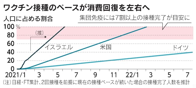 感染拡大で犠牲を払った多くの国では、ワクチン接種のペースがカギを握る。世界で最も接種が進むイスラエルでは人口の3割がすでに必要な2回の接種を終えた。現在のペースが続けば今春に人口の7割以上がウイルスに免疫を持つ「集団免疫」に達する。集団免疫に近づけばウイルスが伝染しづらく、制限を解除しやすくなる。米国は今秋にも集団免疫に達する見通し。一方、接種開始が遅れた日本やワクチンの不足に悩む欧州連合(EU)では正常化が後にずれるおそれがある。