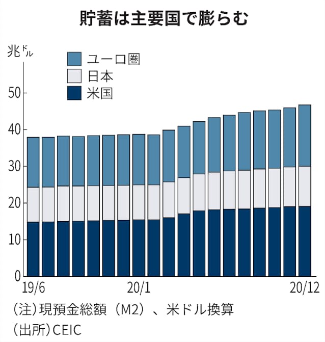2020年は新型コロナウイルスの感染拡大の影響で主要国を中心に貯蓄率が大きく上昇した。外出禁止などの行動制限で消費が抑制されたことに加え、世界各国が景気対策のために一時給付金を実施したためだ。日米とユーロ圏の合計では、現預金総額(M2)が20年12月までの1年間におよそ8兆ドル(約840兆円)増えた。ワクチンの普及や行動制限解除で、21年は膨らんだ貯蓄の取り崩しが消費を押し上げる見通しだ。