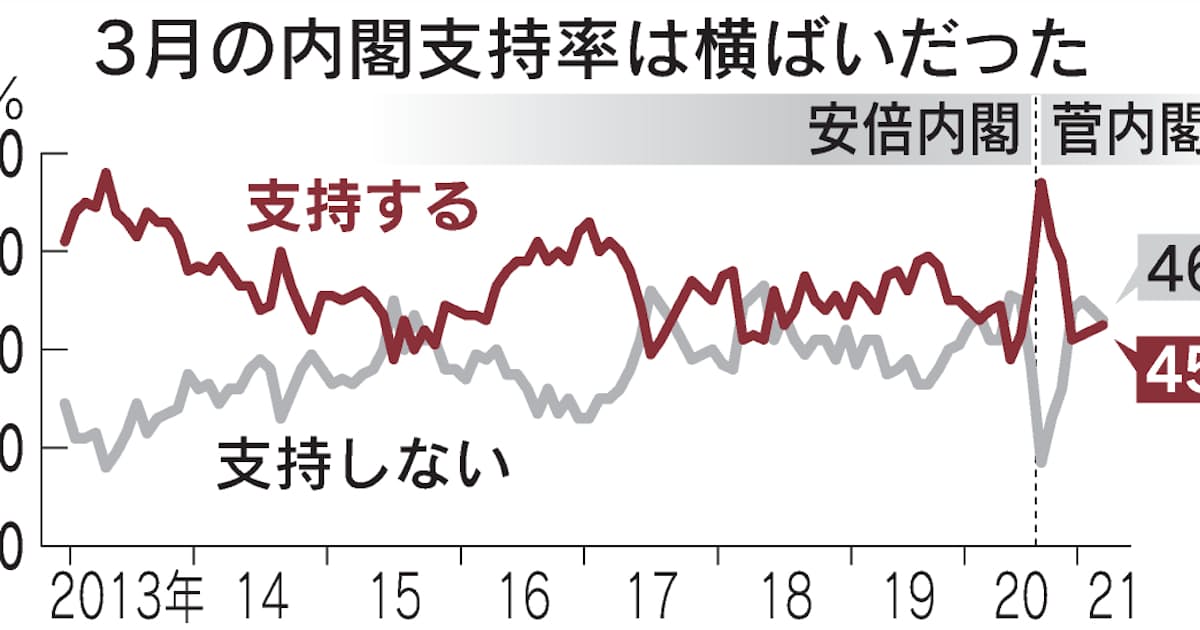 日本経済新聞社とテレビ東京は26~28日に世論調査を実施した。菅義偉内閣の支持率は2月の前回調査から横ばいの45%だった。政府が新型コロナウイルス対応の緊急事態宣言を21日で全面解除したことに52%が「早すぎた」と答えた。