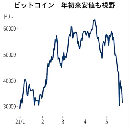 4月につけた史上最高値(6万4801ドル)から一時半値以下に落ち込んだ。5月19日は取引障害などの混乱で、一時3万201ドルまで急落したが、このときを除けば1月29日以来の安値となる。イーサリアムやリップルなどほかの仮想通貨も軒並み急落した。