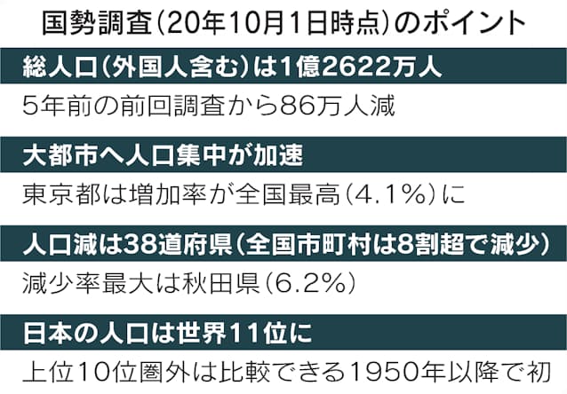 総務省が25日発表した2020年国勢調査(速報)は、大都市への人口集中の加速を浮かび上がらせた。人口が増えたのは東京など大都市を抱える自治体を中心に9都府県にとどまり、秋田など38道府県で人口が減少した。ただ総人口が減る中で、子育て支援の拡充などで人口を増やした市町村も約300自治体あった。成功事例を生かして地方の縮小を食い止める知恵が問われている。