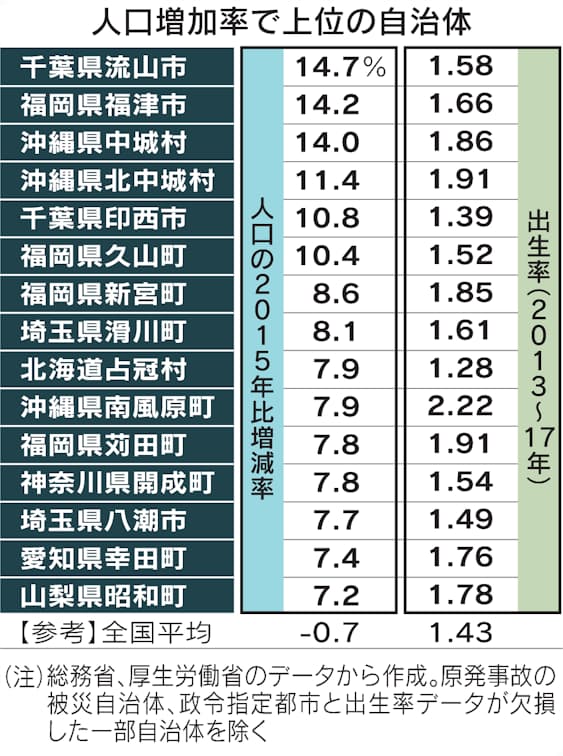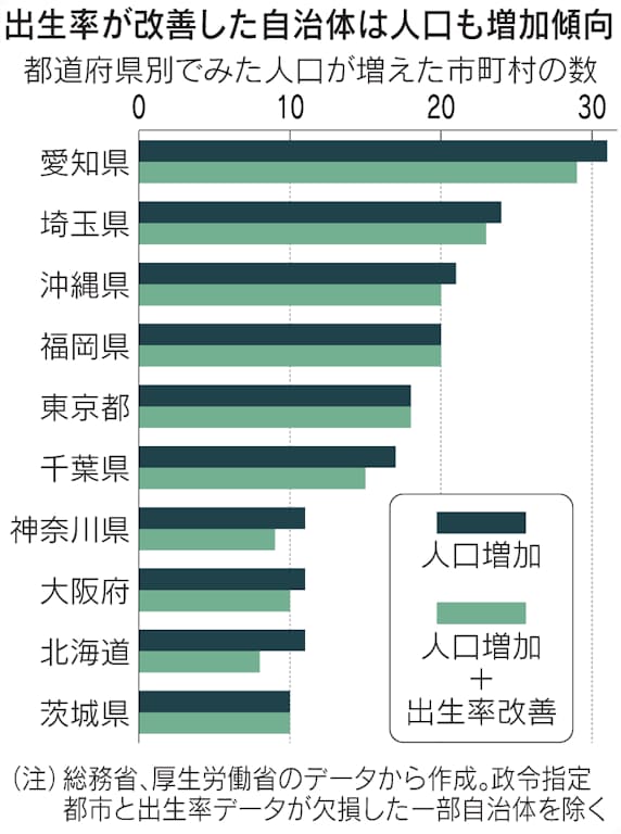 人口増加率が上位の市町村をみると、出生率も高い傾向がある。人口減に歯止めをかけるためには外から人を呼び込むのに加えて、地元で生まれる子どもを増やすための工夫が欠かせない。