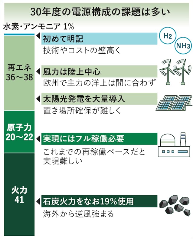 30年度の電力供給を何でまかなうかの比率を①再生エネで36~38%(現行目標は22~24%)②原子力で20~22%(現行目標維持)③温暖化ガスを排出しない水素やアンモニアによる発電で1%(現行はゼロ)④火力で41%(同56%)と定めた。