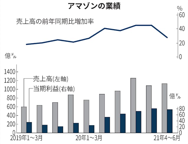 アマゾンは同日、21年7~9月期の営業利益については25億~60億ドルの範囲になるとの予想を示した。前年同期比では3%減から60%減となり、収益力が低下する見通しを示した。