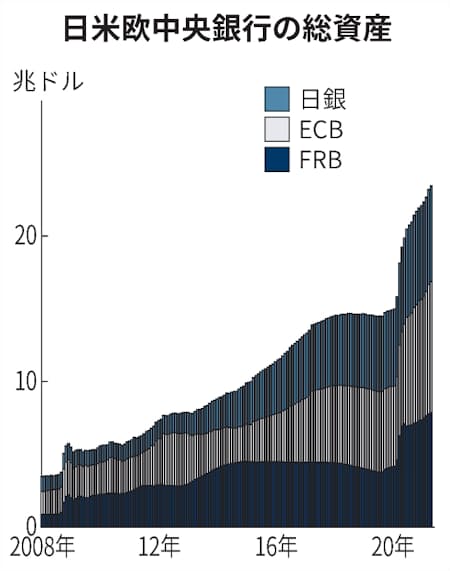 ただ、こうした積極的な金融緩和は、緩和縮小が後手に回るリスクと裏表だ。すでに日米欧の中銀の総資産の合計は20兆ドル(2200兆円)を大きく上回り、08年のリーマン・ショック時の4倍以上に達している。