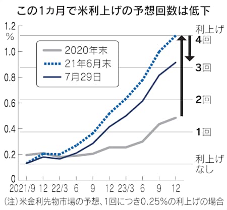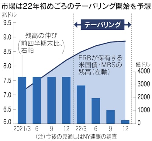 ニューヨーク連邦準備銀行の6月の市場関係者への調査ではテーパリングは21年末から22年初めごろに始まるとの予想が多い。最近は「9月のFOMCでテーパリングの予告が始まり、12月に正式発表になる」(米ゴールドマン・サックスのヤン・ハチウス氏)との見方が大勢だ。パウエル議長は7月14日の議会証言で「私たちがやろうとしていることはある程度市場で織り込まれている」とも述べている。