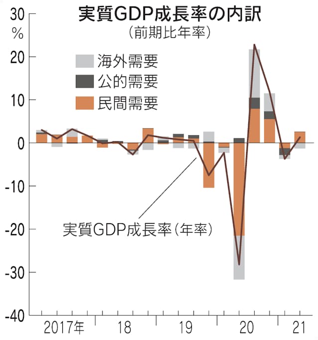 コロナ禍の日本のGDPは、初めて緊急事態宣言が出た20年4~6月期に大幅なマイナス成長となったが、7~9月期と10~12月期はプラス成長が続いていた。21年1~3月期は東京都などへの緊急事態宣言の発令による個人消費の落ちこみが全体を押し下げ、3四半期ぶりのマイナス成長に転じていた。