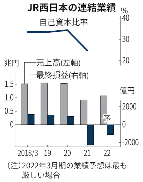 JR西は22年3月期の連結最終損益が最大で1165億円の赤字(前期は2332億円の赤字)になる見通し。自己資本比率は20年3月末の34.1%から21年6月末には22.9%へと低下した。21年3月期に社債の発行や金融機関からの借り入れにより約7000億円を調達、4月にも1600億円の社債を発行していた。