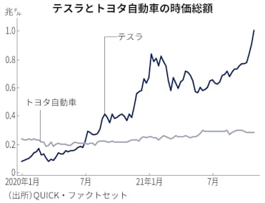 テスラは世界的な排ガス規制の広がりを追い風にEVの販売を伸ばしている。21年通年の販売目標は75万台超とまだ自動車大手の年間販売の10分の1以下だが、高い成長力への期待から20年7月に時価総額でトヨタ自動車を抜き、自動車業界で首位に立った。