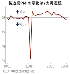 【北京=川手伊織】中国国家統計局が31日発表した2021年10月の製造業購買担当者景気指数(PMI)は49.2と、前月より0.4ポイント低下した。好不調の境目である50を2カ月連続で下回った。資源高による企業収益の悪化で受注が伸び悩み、電力制限も生産の足かせになった。景況感の悪化が止まらない。