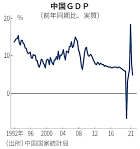 【北京=川手伊織】中国国家統計局が18日発表した2021年7~9月の国内総生産(GDP)は、物価の変動を調整した実質で前年同期比4.9%増えた。4~6月(7.9%増)から減速した。素材高による収益悪化で企業の投資が伸びず、新型コロナウイルスの感染再拡大をうけた移動制限が消費を抑え込んだ。中国景気の停滞感が強まっている。