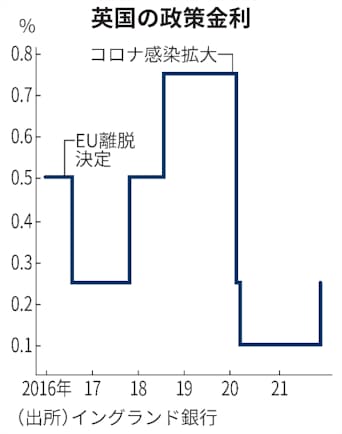 【ロンドン=篠崎健太】英イングランド銀行(中央銀行)は16日、政策金利を0.15%引き上げて同日付で年0.25%にすると発表した。利上げは2018年8月以来3年4カ月ぶり。供給制約やエネルギー価格の高騰で物価上昇率が急拡大するなか、金融緩和からの脱却を決めた。新型コロナウイルスの感染拡大後、利上げしたのは日米欧の主要4中銀で初めて。インフレ抑制へ明確な引き締めにかじを切った。