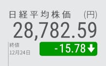 24日の東京株式市場で日経平均株価は4日ぶりに小幅反落し、前日比15円78銭(0.05%)安の2万8782円59銭で終えた。24日は米株式市場が休場となる週末で、持ち高を一方向に傾ける動きは限られた。日中の値幅は96円63銭と、2020年12月25日以来1年ぶりの小ささだった。