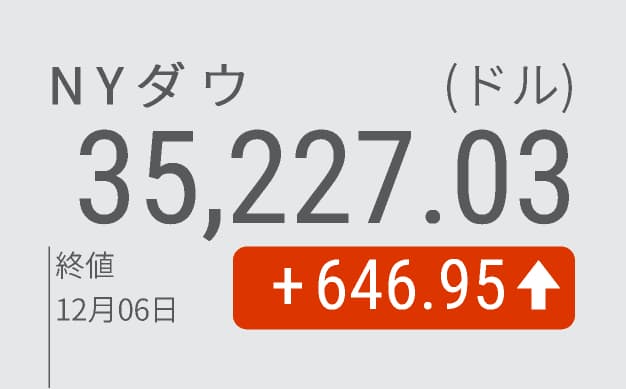 【NQNニューヨーク=川上純平】6日の米株式市場でダウ工業株30種平均は大幅に反発し、前週末比646ドル95セント(1.9%)高の3万5227ドル03セントで終えた。1日の上げ幅としては米大統領選があった2020年11月9日(834ドル高)以来、1年1カ月ぶりの大きさだった。