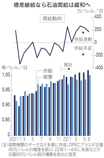 OPECはかねて、22年には原油の供給が需要を上回るとみていた。世界の需要は例年、ガソリン消費や暖房機器の燃料向けが増える12月にかけて拡大する一方、1月は減りやすい。ロイター通信によるとOPECは内部分析で1月の供給過剰が日量200万バレル、2月は340万バレル、3月は380万バレルに膨らむと予測する。オミクロン型の影響でアフリカや欧州を中心に航空燃料の需要がしぼむとみる。