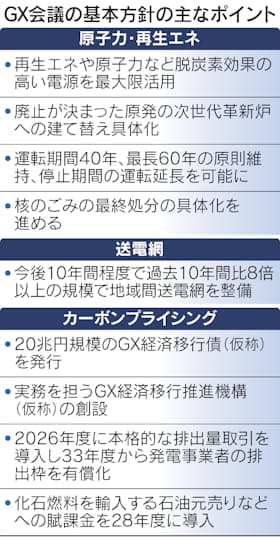 政府は22日、GX(グリーントランスフォーメーション)実行会議を開き、脱炭素社会の実現に向けた基本方針をまとめた。原子力について「将来にわたって持続的に活用する」と明記した。廃止が決まった原子力発電所を建て替え、運転期間も現在の最長60年から延長する。東日本大震災以来「原発の建て替えを想定しない」としてきた政策を転換するが、実現には課題が多く実行力が問われる。